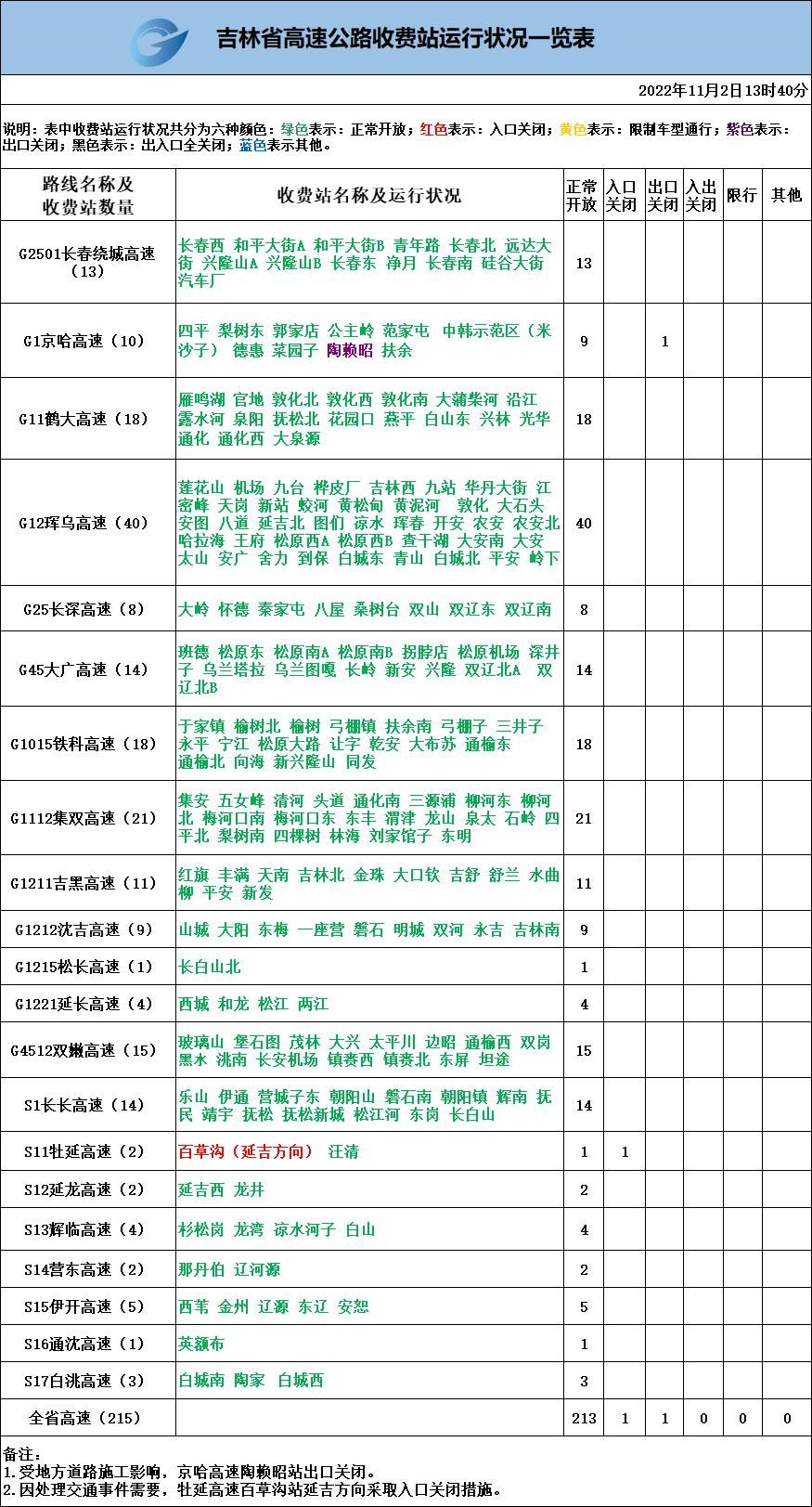 吉林省高速公路收费站运行状态一览表2022年11月2日